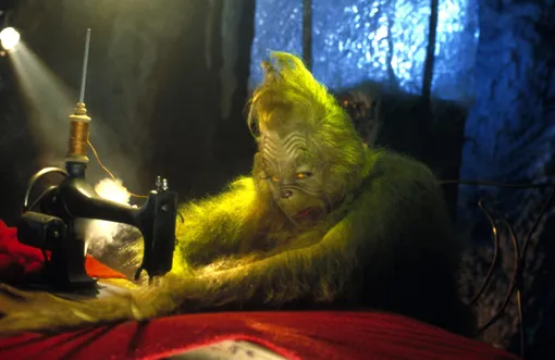 Теперь перейдем к Гринчу. Его Доктор Сьюз описал не то чтобы очень подробно. Из текста ясно, что главный герой зеленый и мохнатый, его голова похожа на продолговатую тыкву (узкая сверху, широкая снизу), а глаза желтые. Гримерам предстояло превратить Джима Керри в Гринча, не ограничив при этом его мимику. В итоге лицевой пластический грим сделали очень тонким в определенных местах, но он все равно доставлял актеру огромные неудобства. В одном из интервью Джим Керри признался, что в образе Гринча чувствовал себя погребенным заживо.