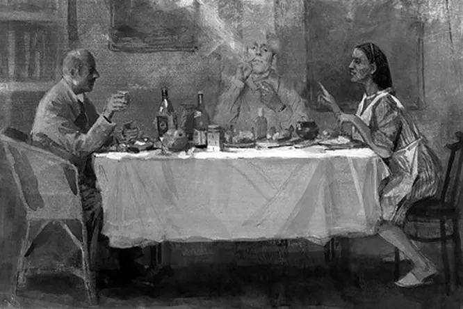 Она сыпала сигаретный пепел на свой несъеденный ужин и говорила, говорила. Ее руки резали воздух, как ножницы. Курильщица она была не ахти какая, главное — актриса, дряхлая кокетка.