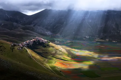 Цветущая долина в поселке Кастеллуччо ди Норча, Умбрия, Италия.