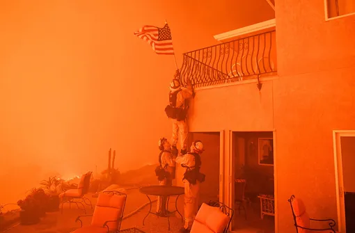 В начале июля Калифорнию охватили разрушительные лесные пожары. На этом снимке пожарные убирают американский флаг, который повесили владельцы одного из домов, оказавшегося близ очага стихийного бедствия.