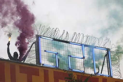 Протестующий с файером в руках во время саммита «большой двадцатки» в Гамбурге, Германия.