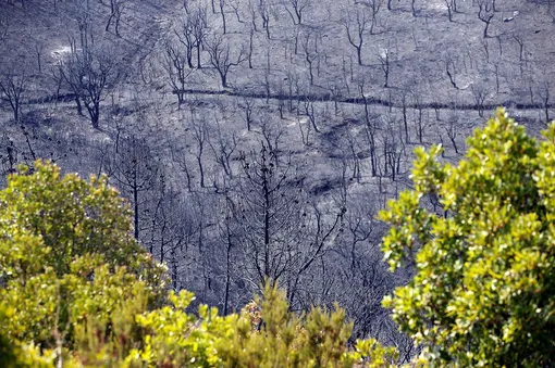 Сгоревшие деревья на склоне холма в районе коммуны Борм-ле-Мимоза, Франция.