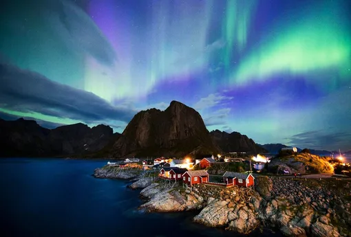 Северное сияние в Рейне, Лофотенские острова, Норвегия.