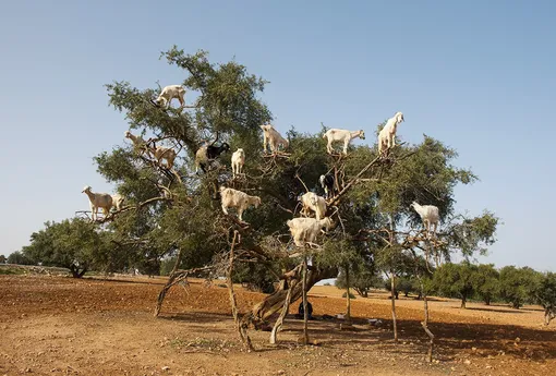 Козы забрались на аргановое дерево в Марокко. Животные питаются шкуркой плодов аргании, из которых получают аргановое масло, широко используемое в косметологии и кулинарии.