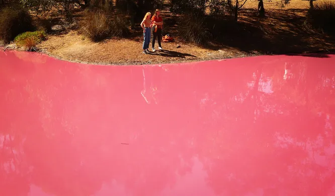 Река окрасилась в розовый цвет в парке «Уэстгейт» в Мельбурне. Это естественный процесс: водоросли, растущие на дне озера, при фотосинтезе выделяют красные пигменты.