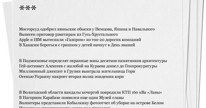 И вот, в этот самый обычный день случилось следующее. Русская православная церковь заявила, что игумен Тимофей, настоятель храма Пророка Илии в Обыденском переулке, который попал в аварию за рулем машины BMW Z4, действовал как частное лицо, и церковь за него не отвечает (примерно то же самое заявляло министерство внутренних дел, когда майор милиции Евсюков устроил бойню в магазине). Выяснилось, что калининградские чиновники выдавали своих детей за инвалидов, чтобы те могли поступить в институт, в Назрани был взорван винно-водочный магазин, президент Чечни Рамзан Кадыров дал урок конституционного устройства нашей страны губернатору Краснодарского края Александру Ткачеву, а уральские заключенные начали голодовку из-за жестокости администрации ИК №6 города Копейска. И так далее. Кажется, в этот день в России было только два приятных события — ушел в отставку мэр города Химки Владимир Стрельченко, а полиция принесла извинения Ильнуру Шарапову и Николаю Помещенко, задержанным на Болотной при игре в петанк (но ведь 4 августа их задержали, и это тоже была новость).