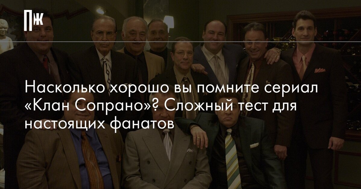 Сериал «Клан Сопрано» завершился уже больше 15 лет назад, но все еще считается одним из лучших на телевидении. Чего только стоит финальная сцена, споры о которой не утихают до сих пор. Ее действительно невозможно забыть, но вот каждую деталь помнят, пожалуй, только истинные поклонники сериала. Пройдите наш тест и узнайте, не пора ли в очередной раз пересмотреть легендарное шоу.