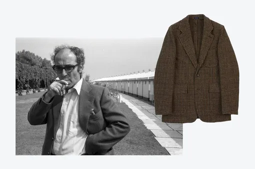 Пиджак для Годара был чем-то вроде защитной оболочки, способом сохранить структуру в хаосе. Он почти всегда был с ним. Плотный твид или шерсть, мягкая посадка, неидеальные плечи, легкая небрежность, как будто он куплен не в магазине, а у старого профессора в Сорбонне. Под ним — рубашка или легкое поло. Снизу — непарные брюки или джинсы.