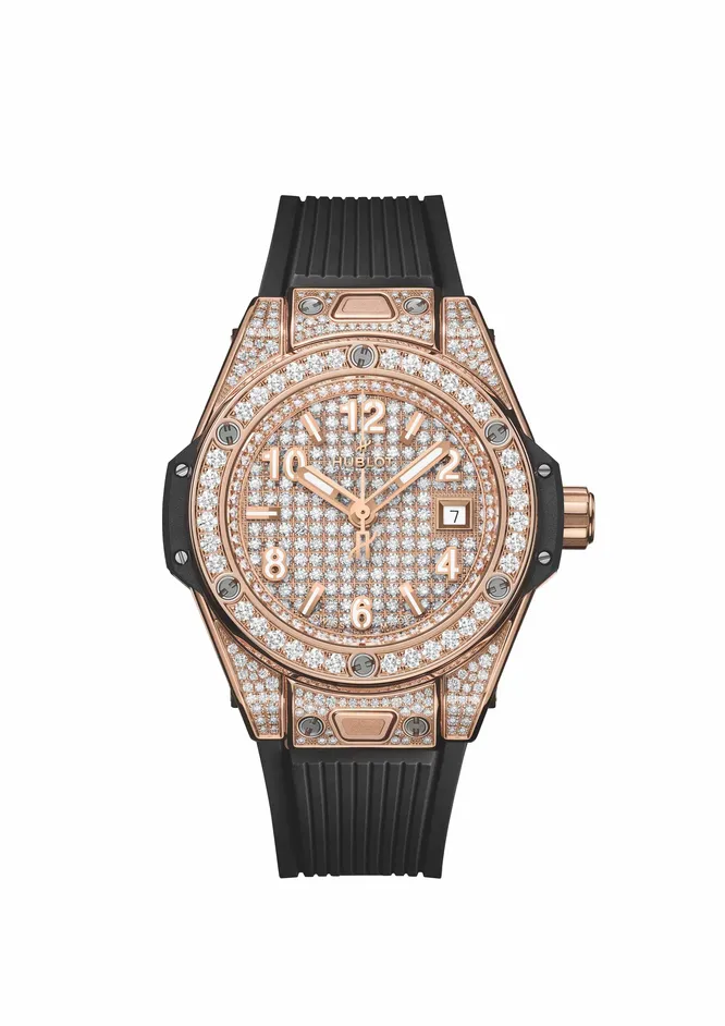 Корпусы новых Big Bang One Click, в зависимости от модели, выполнены частично или полностью из уникального сплава King Gold или стали, а у версий Pavé и Full Pavé они декорированы 130 бриллиантами. Безели всех моделей украшены 36 камнями. Часовые метки, расположенные на черных или белых циферблатах, также оформлены бриллиантами классической огранки; в эксклюзивных версиях Full Pavé на циферблате располагается 232 бриллианта.