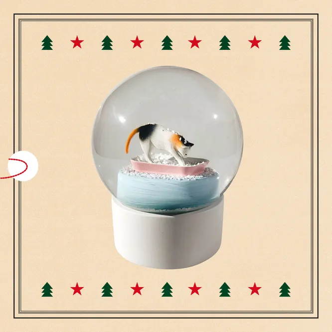 Самая новогодняя безделушка — снежный шар, но кому нужны рождественские елки и заснеженный лес, когда есть целеустремленный кот и его лоток.