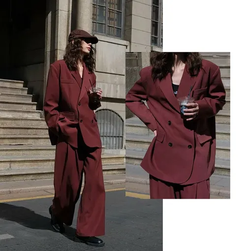 Для тех, кто даже в Новый год предпочитает выглядеть собранно, брючный костюм остается одним из самых логичных вариантов. Современные оверсайз-модели с мягкой линией плеч и свободной посадкой выглядят менее формально, чем классический офисный силуэт. Универсальными вариантами будут костюмы в бордовых, темно-зеленых или молочных оттенках. Праздничное настроение здесь создают детали: яркий галстук, массивные украшения или платок, повязанный на пояс или вместо ремня.