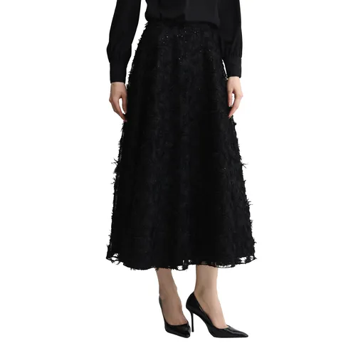 Юбка дает больше свободы, чем платье, и позволяет точнее задать характер наряда. Миди и макси выглядят собранно, мини — более неформально и по-вечернему. Атласные, бархатные юбки или модели с узорами легко становятся центральным элементом, если остальная часть образа остается сдержанной. Самый надежный прием — сочетать выразительную юбку с простым топом, тонким трикотажем или лаконичной рубашкой без декора.