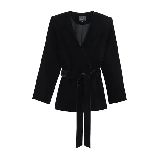 Еще один потенциальный образ для праздничного вечера. Приталенный образ, пояс и красивый V-образный вырез на лицевой стороне жакета. Очень женственный образ под любой красивый повод.