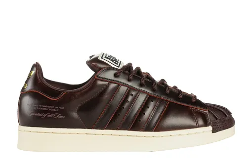 Вторая версия легендарных кроссовок с мысом-«ракушкой» появилась спустя шесть лет после выхода оригинала, отличаясь большей массивностью и объемным язычком с набивкой. Сегодня изначально спортивная модель особенно радует глаз, если выполнена из высококлассных материалов — даже Prada в 2020-м использовали для сотрудничества оригинальные «суперстары». Коллаборация с обществом, владеющим правами на имя Мухаммада Али, использует коды классического бокса. Вместо шнурков — канаты, логотип adidas стилизован под эмблему бренда экипировки Everlast (именно ее носил Али), а выбранная нами коричневая расцветка отсылает к коже старых боксерских перчаток.