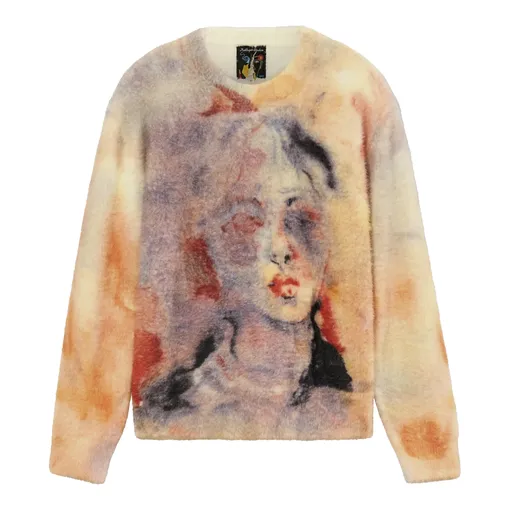 Бренд KidSuper уже плотно ассоциируется у нас с яркими акцентными вещами, поэтому их свитер приятного персикового цвета с акцентным акварельным рисунком открывает нашу подборку. Наш любимый факт — картины для этих принтов создаются специально в творческой студии бренда.