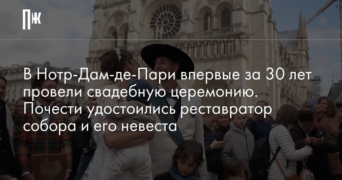 В соборе Парижской Богоматери впервые за 30 лет прошла церемония венчания. В Нотр-Дам-де-Пари состоялась свадьба одного из реставраторов собора Мартина Лоренца и его невесты Джейд, сообщает France 24 TV.