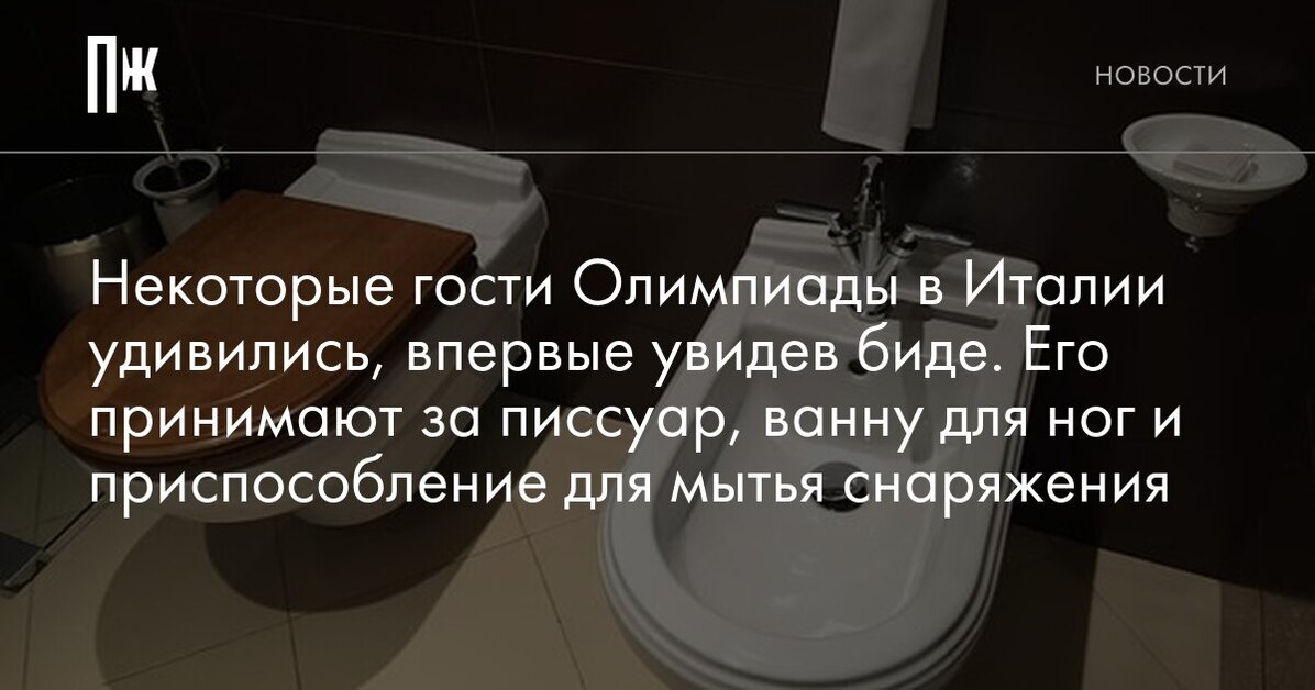 Некоторые североамериканские журналисты, спортсмены и болельщики, приехавшие на Олимпиаду в Италию, были удивлены, обнаружив в ванных комнатах своих номеров биде. Кто-то решил, что это писсуар, а кто-то принял биде за ванну для ног и приспособление для мытья хоккейного снаряжения, сообщает канадский портал Your Thunder Bay.