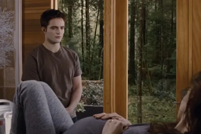 В этой сцене вампир Эдвард Каллен (Роберт Паттинсон) разговаривает с беременной Беллой Свон (Кристен Стюарт), а потом отходит к окну. Актеру не удается подавить легкую улыбку, когда он смотрит на коллегу, а потом он снова ухмыляется, когда отворачивается от нее.