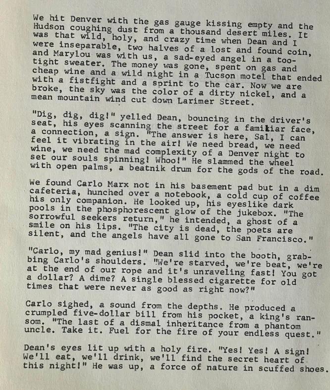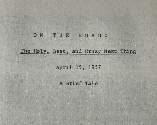 Керуак озаглавил двухстраничную рукопись как On the Road: The Holy, Beat, and Crazy Next Thing и подписал зелеными чернилами. Текст был завершен 15 апреля 1957 года — за пять месяцев до публикации «В дороге».