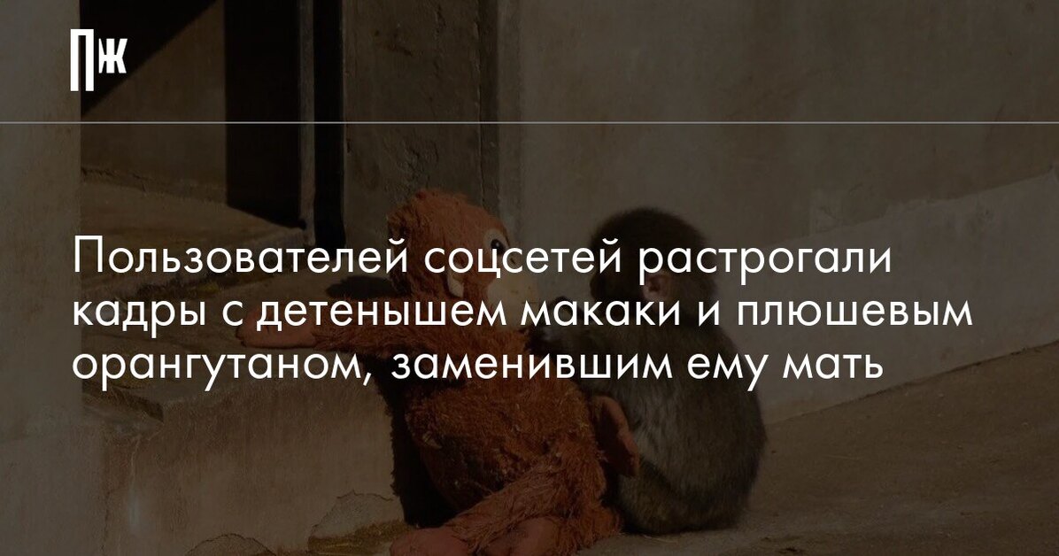 Пользователей соцсетей растрогали кадры с детенышем макаки и плюшевым орангутаном, заменившим ему мать