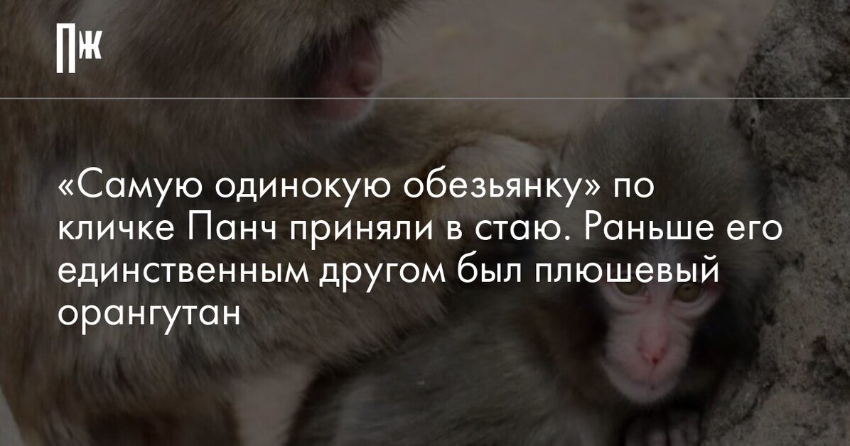 В зоопарке японского города Итикава детеныша макаки по кличке Панч приняли в стаю. Он прославился в соцсетях из-за того, что раньше везде носил с собой плюшевого орангутана — своего единственного друга.