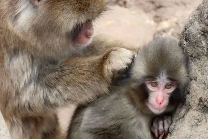 Одна макака из стаи начала заботиться о детеныше, вычесывая блох из его шерсти.