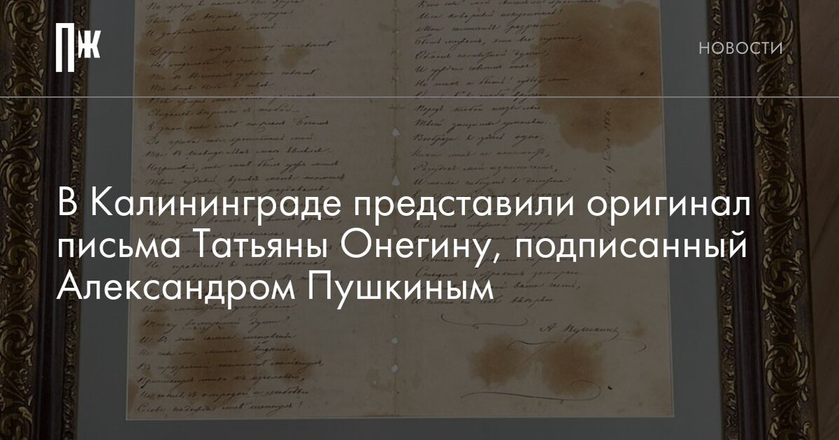 Оригинальную рукопись письма Татьяны Онегину из романа «Евгений Онегин» с автографом поэта Александра Пушкина представили в Калининградском областном историко-художественном музее. Об этом сообщается на странице музея во «ВКонтакте».