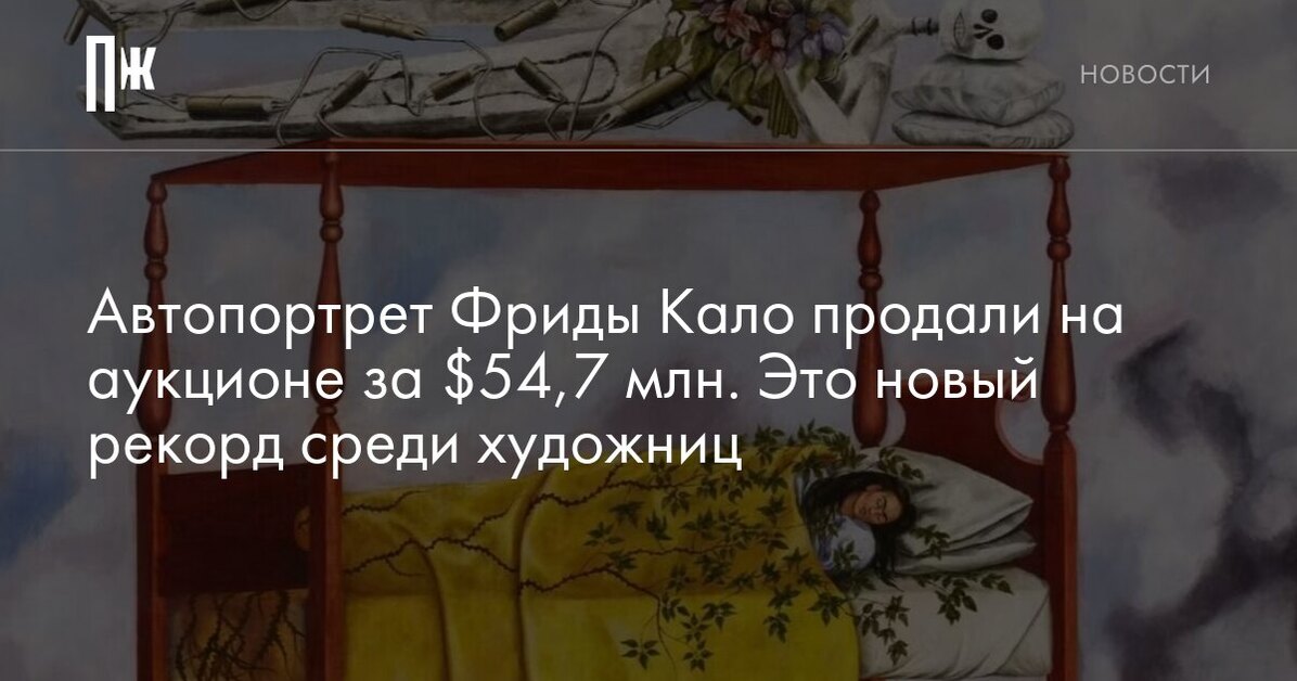 Автопортрет Фриды Кало El sueño (La cama) («Сон (Кровать)») 1940 года был продан на аукционе Sotheby's в Нью-Йорке за $54,7 млн, став самым дорогим произведением художницы. Об этом сообщает Associated Press.