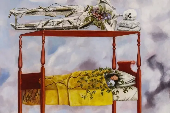 На картине El sueño (La cama), поступившей из частной коллекции, изображена спящая Кало в деревянной кровати, окруженная облаками, лианами и листьями. Над постелью — фигура скелета, обернутого динамитом. Картина отражает темы боли, смерти и личной истории художницы, пережившей тяжелую аварию в 18 лет и ставшей долгие годы прикованной к кровати.