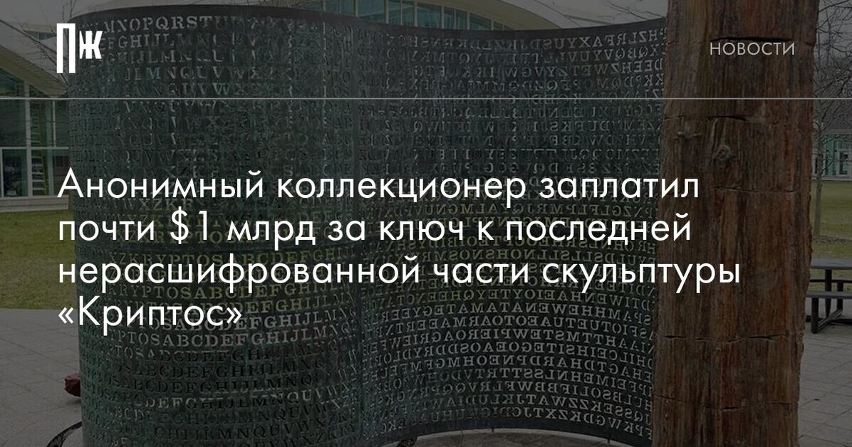 Анонимный коллекционер заплатил почти $1 млрд за ключ к последней нерасшифрованной части скульптуры «Криптос»