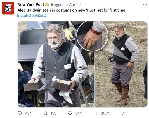 Издание The New York Post опубликовало первые фотографии с возобновленных 20 апреля съемок вестерна «Ржавчина» (Rust), на которых 21 октября 2021 после выстрела ружья в руках Алека Болдуина погибла оператор Галина Хатчинс.