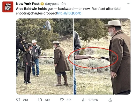 На показанных изданием снимках видно, что актер держит ружье, не направляя его на стоящих перед ним людей. При этом неизвестно, держит ли Болдуин оружие именно так из соображений безопасности или потому, что это часть сцены.