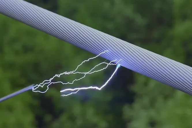 Человек на линии электропередачи под напряжением в 500 000 вольт