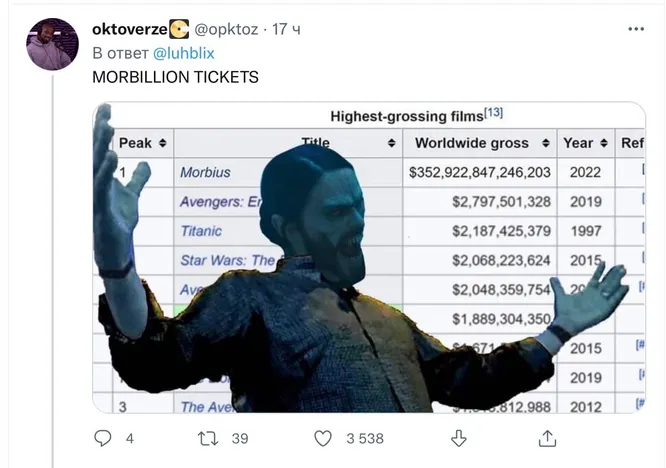 Зато новый провал «Морбиуса» привел к тому, что в сети началась новая волна мемов о фильме. Фанаты шутят, что на самом деле картина собрала $85 «морбиллионов», а создатели и вовсе ожидали получить «мортриллионы».