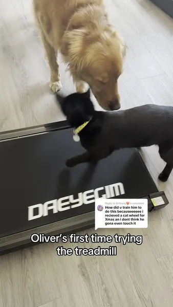Хозяйка Оливера работала из дома и, чтобы делать «несколько шагов в течение дня», в какой-то момент купила беговую дорожку. Однажды во время тренировки кот решил присоединиться к Овьи: он начал ставить лапки на дорожку, как бы проверяя, сможет ли тоже пройтись по ней.