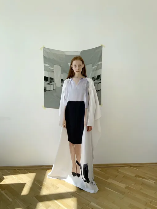 Для тех, кто скучает по родному офису, Тигран Аветисян, основатель бренда Tigran Avetisyan, создал ироничный комплект под названием Today I will stay out of office!, имитирующий офисный костюм. Халат и платок можно надеть во время конференции с коллегами, а после работы повесить его на стену в качестве произведения искусства — настолько нестандартным и универсальным получилось решение Тиграна.