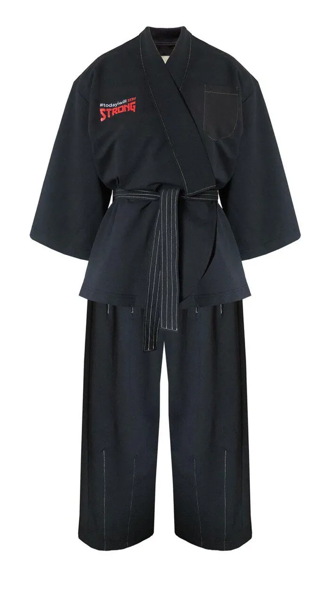 Вдохновившись японскими фильмами 1950‒1960-х годов, основатели бренда Outlaw Moscow Диляра Минрахманова и Максим Башкаев создали комплект из черного японского кимоно и широких штанов хакама, дополненный логотипом Today I will stay strong! Стильный, в меру строгий и удобный — то, что нужно для дома и рабочих видеозвонков.