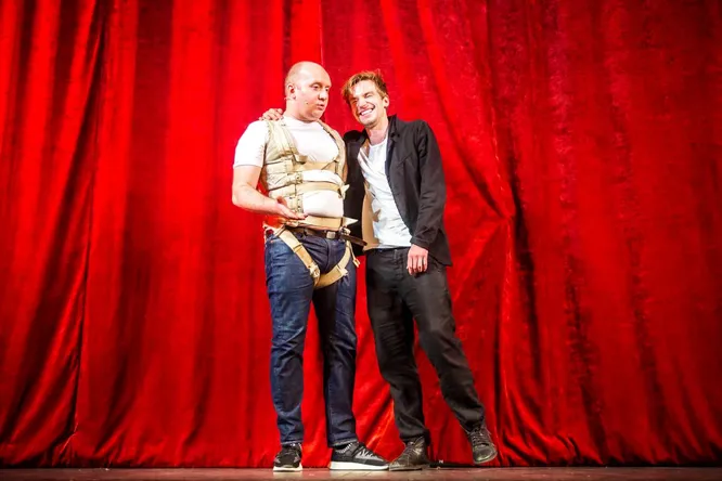 Во время спектакля на сцене происходил диалог без сценария и страховки, в котором Петров и Бурунов обсудили недавнюю премию ТЭФИ, школьные уроки труда, работу в Театре сатиры и множество других событий из жизни, а также ответили на вопросы зрителей. По ходу «Эстафетного интервью» происходило множество событий: актриса Саша Бортич по видеосвязи попросила Сергея Бурунова исполнить фирменный танец, Петров разыграл с гостьей из зала сцену из сериала «Полицейский с Рублевки», а в завершение спектакля Бурунов воспарил под потолок театра. Музыкальными гостями мероприятия стала группа BrainStorm — вместе с Александром Петровым они исполнили песню «На заре», а также свои хиты «Ветер» и «Выходные».