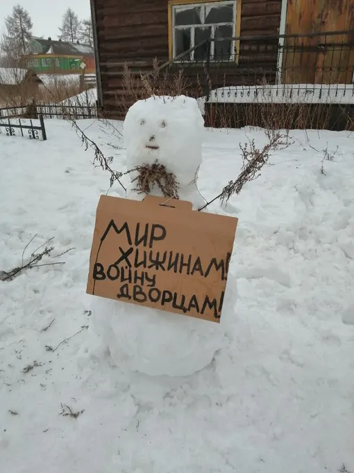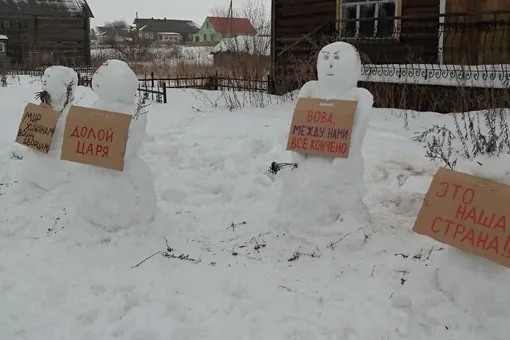 В архангельской деревне Зачачье прошел «массовый пикет» снеговиков. Накануне днем они появились у одного из домов с плакатами «Мир хижинам, войну дворцам», «Долой царя», «Вова, между нами все кончено» и «Это наша страна», а сегодня привлекли внимание полиции. Несогласованный митинг разогнали.