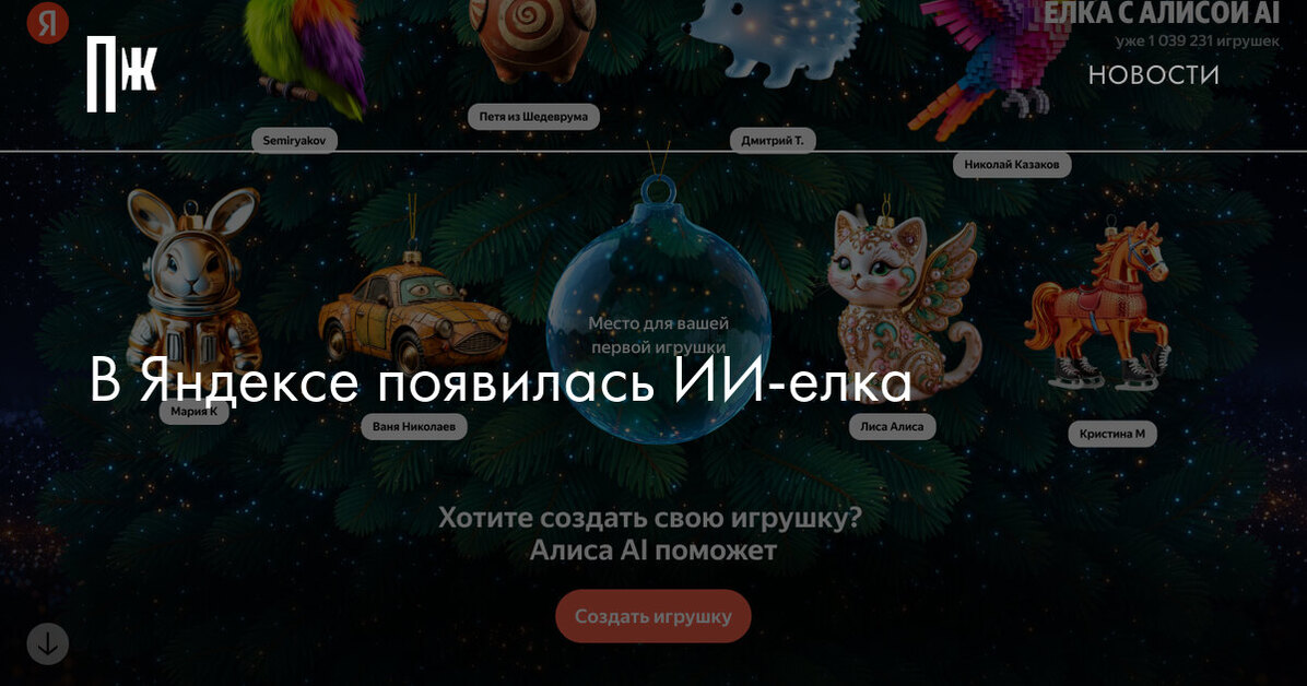 На главной странице Яндекса появилась цифровая новогодняя елка. Пользователи могут украсить ее виртуальными игрушками, созданными с помощью нейросети Алиса AI, и получить подарки.