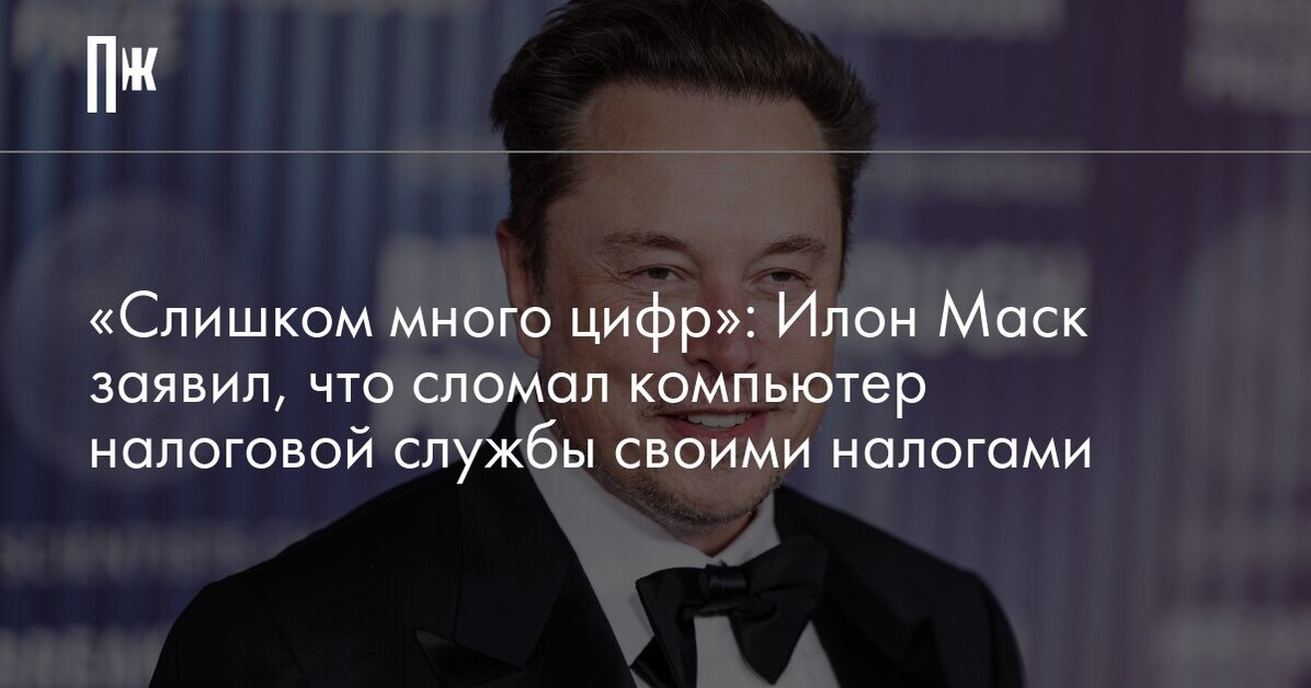 «Однажды я заплатил так много налогов, что это сломало компьютер налоговой службы (на самом деле). Слишком много цифр», — заявил Маск. Мллиардер добавил, что госсу пришлось «обновить программное обеспечение», чтобы обработать всю сумму, что заплатил Маск.