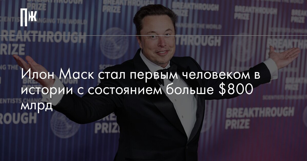 Илон Маск стал первым человеком в истории с состоянием больше $800 млрд