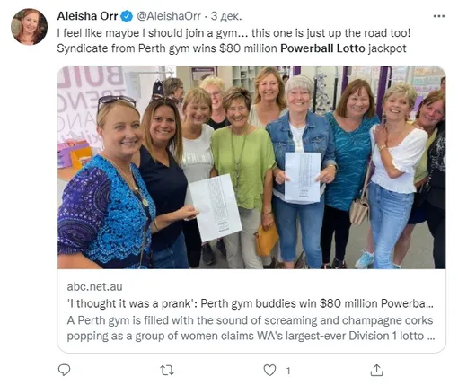 55 женщин, которые ходят в тренажерный спортзал в Белдоне (пригород Перта в Австралии), празднуют крупную победу. Они сорвали джекпот Powerball Lotto в размере $80 миллионов. Об этом пишет ABC News.