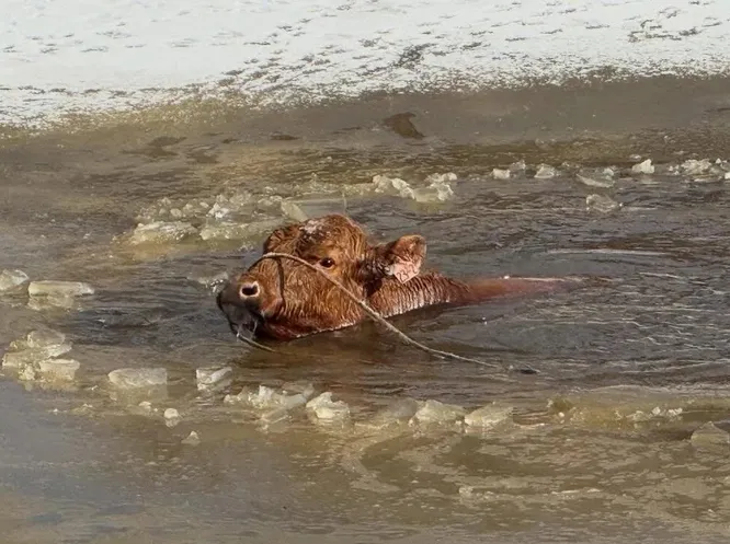 На фотографиях с места происшествия видно, как корова изо всех сил держится, держа голову над ледяной водой.