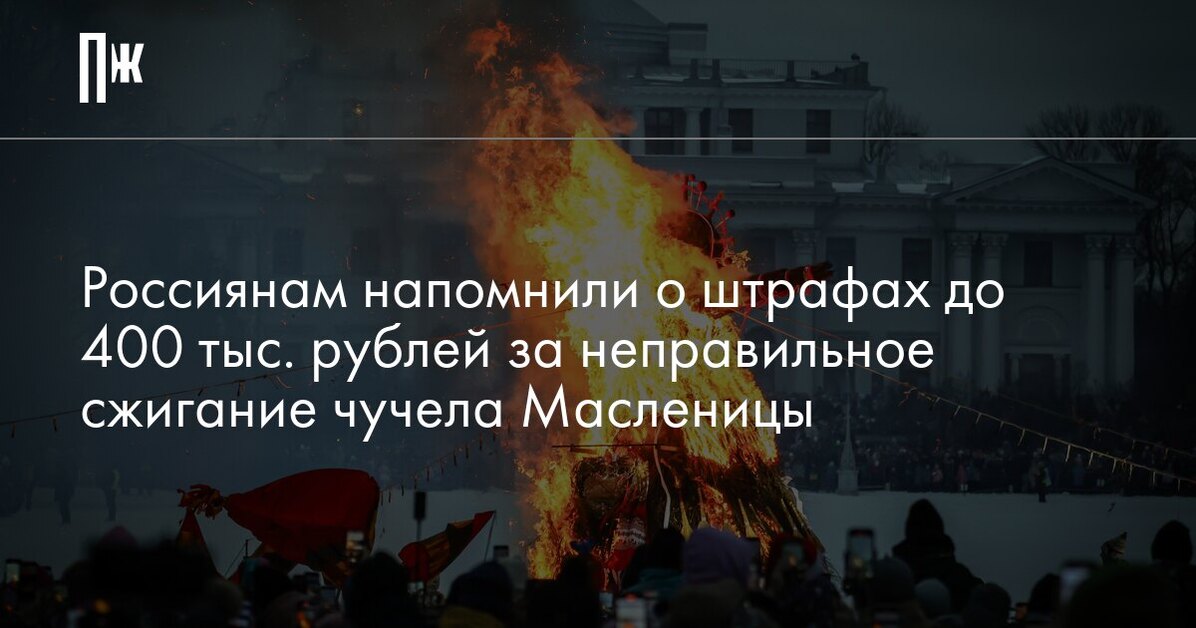 Если при сжигании Масленицы начался пожар, пострадали люди или имущество, то размеры штрафов увеличиваются до 40–50 тыс. рублей для физлиц, до 90–110 тыс. — для ИП и до 800 тыс. — для юрлиц.