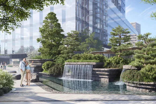 Украшением общественного пространства станет скала с водопадом, выполненная из натурального камня. Поблизости, наслаждаясь успокаивающим звучанием воды, можно поработать на свежем воздухе: здесь расположатся коворкинг и скамейки из натуральных материалов с возможностью зарядки гаджетов.