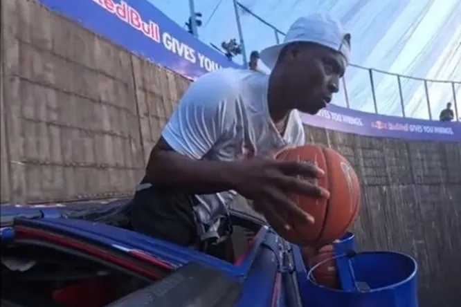 Баскетбольный тренер и блогер Lethal Shooter смог забросить мяч в кольцо, находясь в движущейся по стене машине.