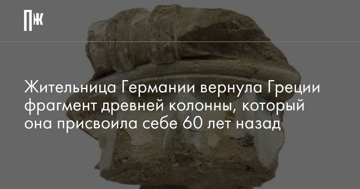 Жительница Германии украла фрагмент античной колонны, но спустя 60 лет все же вернула артефакт греческим властям. Об этом сообщается на сайте Минкультуры Греции.