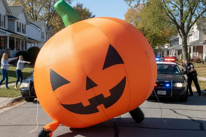 Украшение к грядущему Хеллоуину унесло со двора одного из местных жителей. Надувная тыква перемещалась по улицам города и мешала дорожному движению, что заставило местных правоохранителей вмешаться в происходящее.