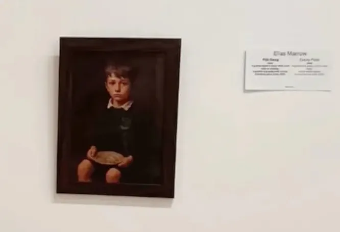 На картине ИИ, имитирующей реалистичный портрет маслом, изображен мальчик в школьной форме, с книгой под мышкой и с пустой тарелкой на коленях. По словам Марроу, сначала он сам нарисовал набросок, а потом попросил ИИ усовершенствовать рисунок для печати.